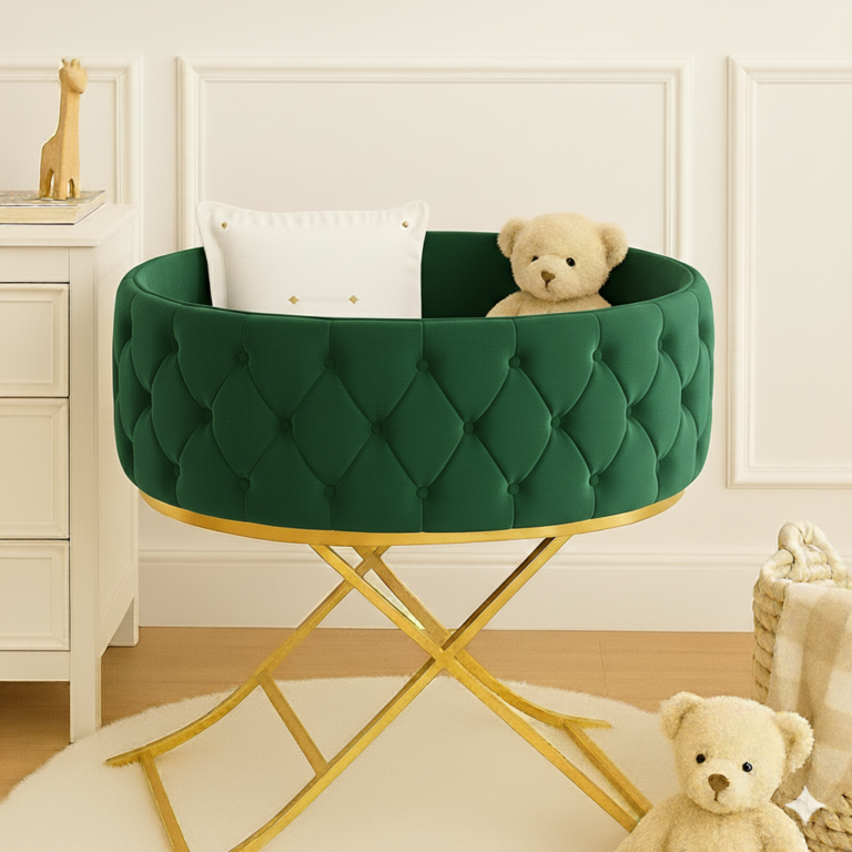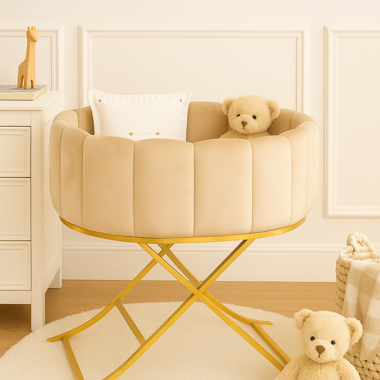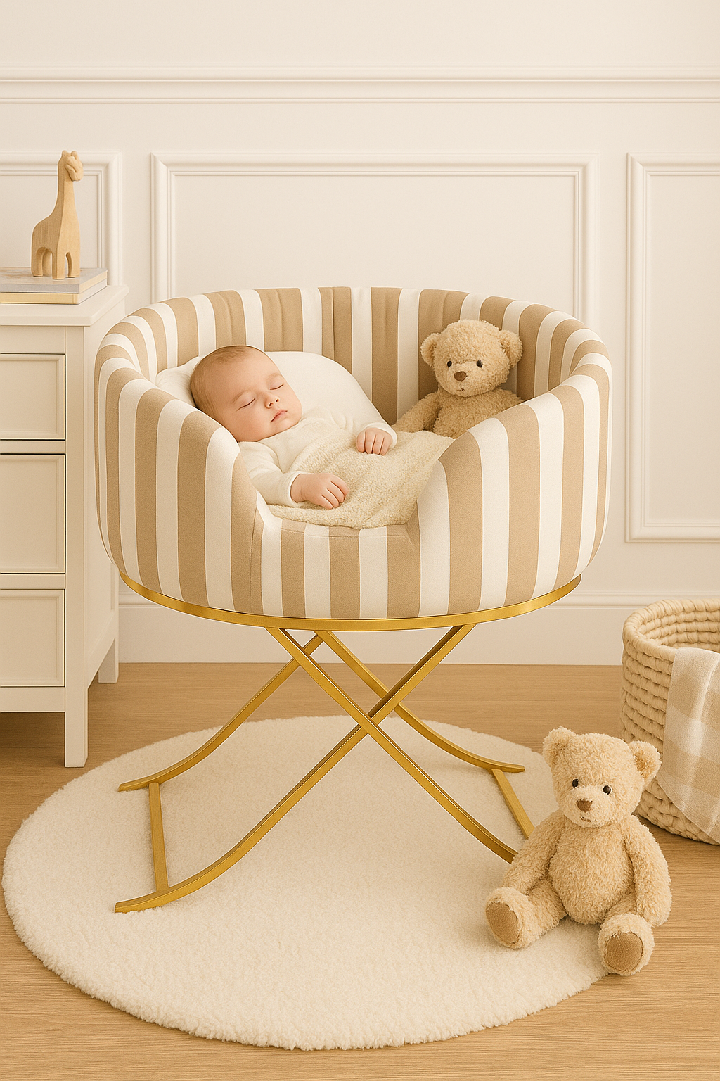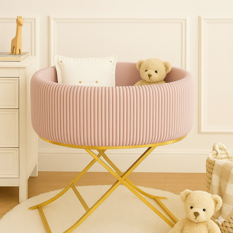 A luxurious baby bassinet crafted for elegance and comfort. With fine-striped fabric and a smooth swinging base, it offers a soothing cradle-like motion. Premium materials and refined detailing create a serene, stylish resting space for your little one.